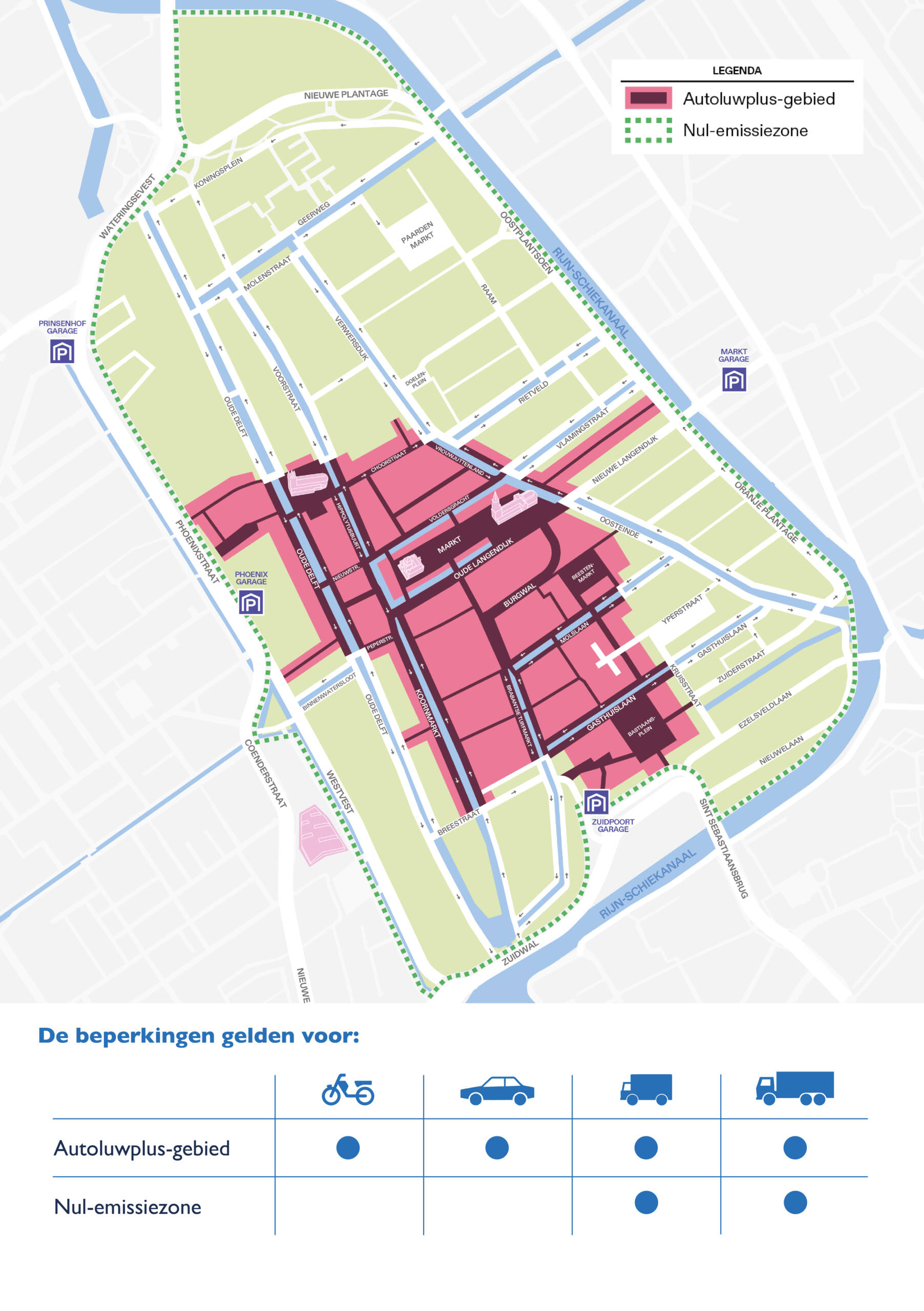 De hele binnenstad van Delft is een nul-emissiezone voor bestel- en vrachtauto’s. Het autoluwplus-gebied daarmee ook. Een bestel- of vrachtauto dient te voldoen aan de toegangsregels van de nul-emissiezone. Meer informatie over de nul-emissiezone vindt u hier.